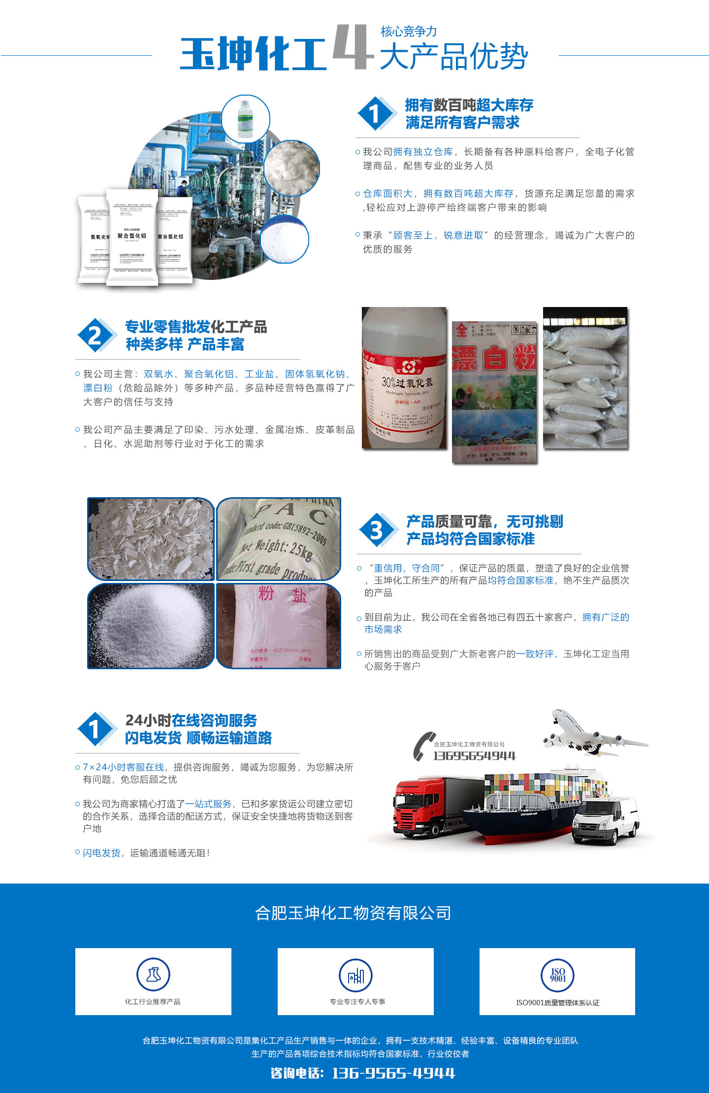 合肥玉坤化工物資有限公司自創辦以來,玉坤化工一直專注于化工行業,在該領域具備了明顯的技術、生產和服務優勢。我們堅持以技術為先導,持續進行產品開發,不斷提高技術、生產水平;成立了研發中心,持續引進高素質技術人才,擁有一支認真負責的研發團隊。公司一貫遵循“以市場為導向、以質量求生存、以信譽拓市場”的發展思路,始終致力于為客戶提供產品和滿意的服務。我們將憑借技術人才、精良的設備、可靠的技術、科學的管理、服務,以“質量為先、信譽為重、管理為本、服務為誠”的理念,求真務實、銳意創新的開拓精神,積極圍繞公司的發展戰略目標,努力把公司建設成技術密集型、外向行、市場型的國內先進的精細化...